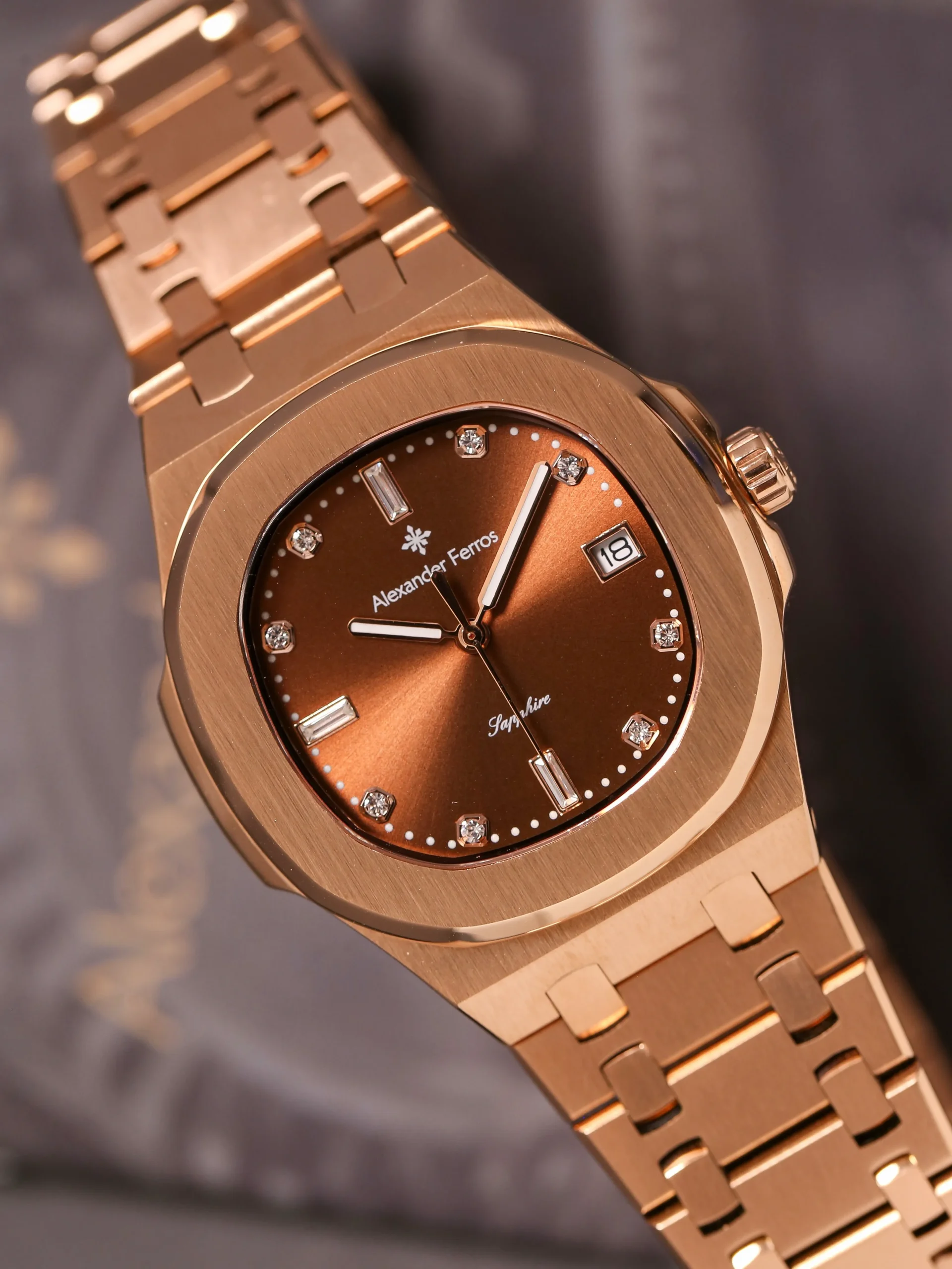 Alexander Ferros 6152R gây ấn tượng với thiết kế sang trọng, vỏ và dây đeo thép không gỉ mạ vàng hồng cao cấp. Mặt số tối giản nhưng tinh tế cùng bộ máy Nhật Bản bền bỉ, chính xác giúp sản phẩm trở thành lựa chọn lý tưởng cho những ai yêu thích sự đẳng cấp và hiện đại.