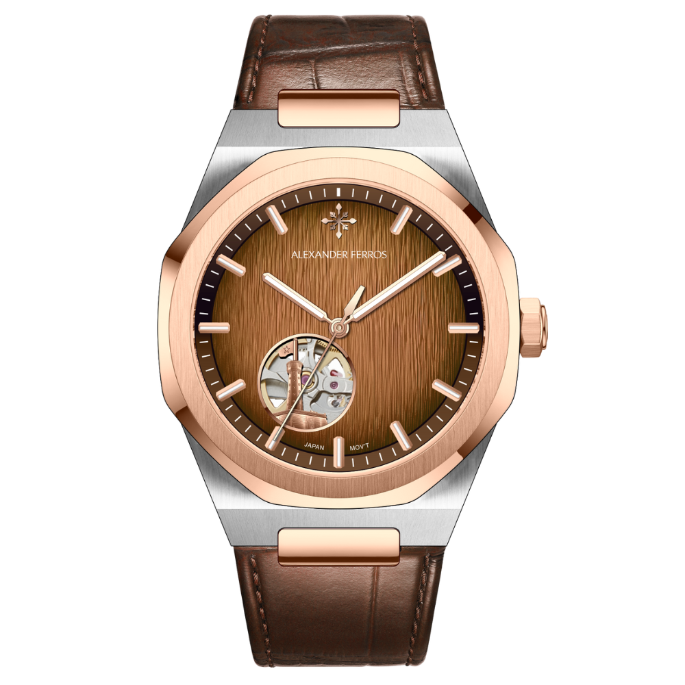 Alexander Ferros 9292 là mẫu đồng hồ nam nổi bật với phong cách thể thao lịch lãm và thiết kế hiện đại. Mặt số với nhiều phiên bản màu được trang trí bằng họa tiết vân gỗ độc đáo, kết hợp cùng bộ kim và cọc số dạng vạch phủ dạ quang, giúp dễ dàng quan sát giờ trong điều kiện thiếu sáng. Điểm đặc biệt của mẫu này là thiết kế Open heart góc 7h kết hợp với hình ảnh Cột cờ Dinh Độc Lập mang bản sắc riêng.