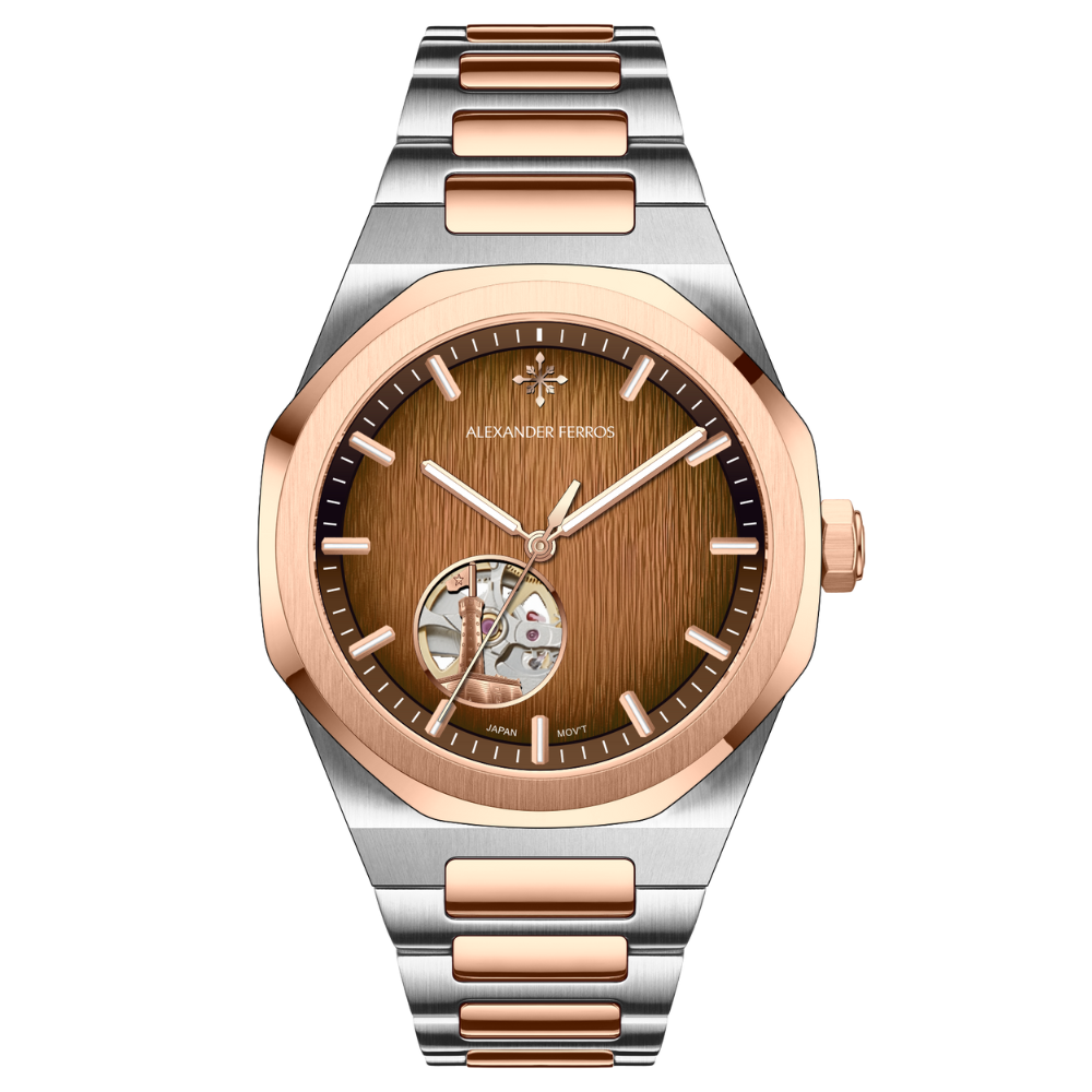 Alexander Ferros 9292 là mẫu đồng hồ nam nổi bật với phong cách thể thao lịch lãm và thiết kế hiện đại. Mặt số với nhiều phiên bản màu được trang trí bằng họa tiết vân gỗ độc đáo, kết hợp cùng bộ kim và cọc số dạng vạch phủ dạ quang, giúp dễ dàng quan sát giờ trong điều kiện thiếu sáng. Điểm đặc biệt của mẫu này là thiết kế Open heart góc 7h kết hợp với hình ảnh Cột cờ Dinh Độc Lập mang bản sắc riêng.