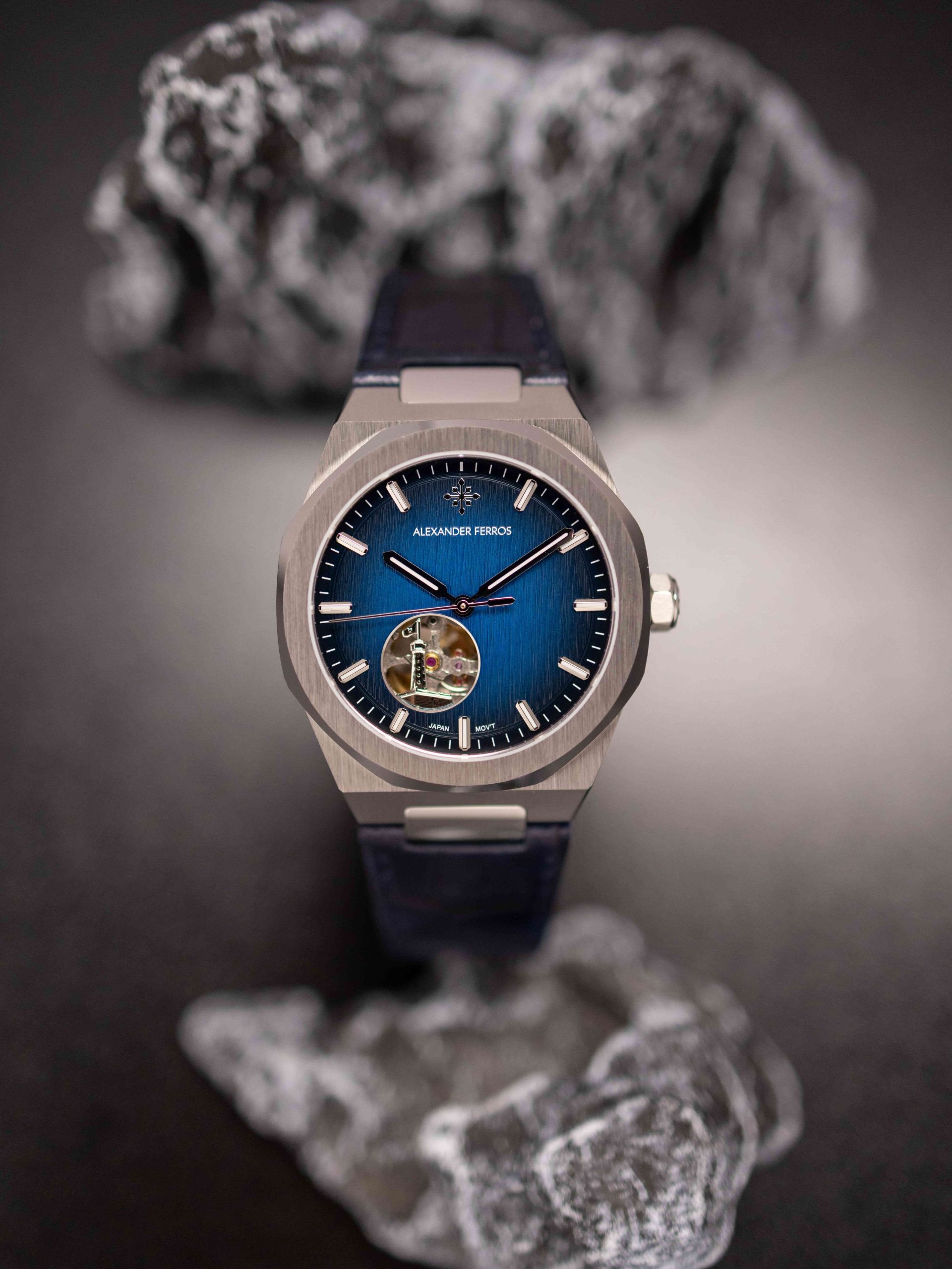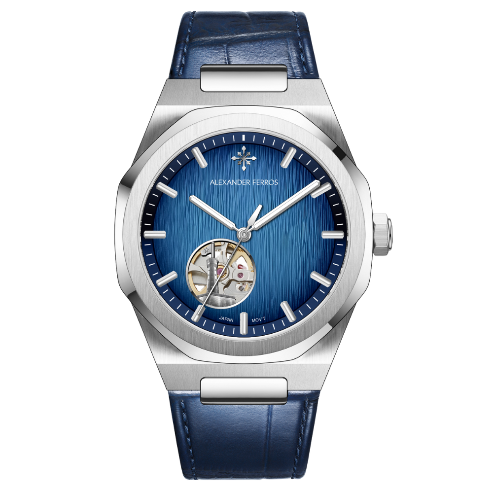 Alexander Ferros 9292 là mẫu đồng hồ nam nổi bật với phong cách thể thao lịch lãm và thiết kế hiện đại. Mặt số với nhiều phiên bản màu được trang trí bằng họa tiết vân gỗ độc đáo, kết hợp cùng bộ kim và cọc số dạng vạch phủ dạ quang, giúp dễ dàng quan sát giờ trong điều kiện thiếu sáng. Điểm đặc biệt của mẫu này là thiết kế Open heart góc 7h kết hợp với hình ảnh Cột cờ Dinh Độc Lập mang bản sắc riêng.