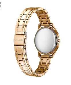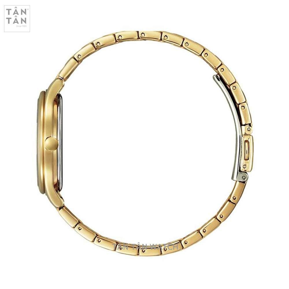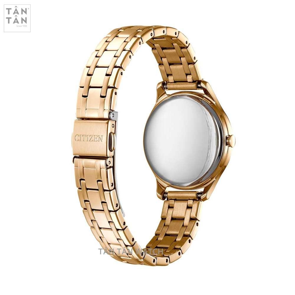 Bên cạnh đó, Citizen EM0503-75X còn được trang bị dây đeo thép không gỉ nguyên khối với những tính năng nổi trội mà các loại chất liệu khác không có đó là độ bền, độ cứng cao hơn giúp chống trầy xước khi va chạm. Dây đeo cũng được hoàn thiện tỉ mỉ phủ màu vàng hồng với những đường đánh bóng xen kẽ đánh phay xước tạo nên vẻ ngoài đồng hồ bắt mắt hơn, khi nghiêng đồng hồ theo góc sáng bộ dây sẽ phản chiếu lại ánh sáng rất đẹp mắt. Đi cùng bộ dây là khóa gập với nút bấm tiện lợi và thẩm mỹ, với cơ cấu đơn giản các quý cô có thể sử dụng dễ dàng hàng ngày khi tháo ra và mang vào.