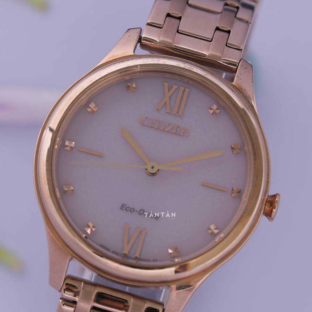 Citizen EM0503-75X có đường kính 32mm và độ dày 7.3mm phù hợp với đa số cổ tay các quý cô. Với tông màu vàng hồng, Citizen EM0503-75X như một bông hoa tuyết rực rỡ, đề cao sự quyến rũ và thời thượng của các quý cô hiện nay. Ngoài ra, chiếc đồng hồ nữ này còn có khả năng chống nước WR50 (tương đương áp suất ở độ sâu 50m nước), hỗ trợ các nàng đi mưa nhẹ, rửa tay hay đi tắm mà không lo đồng hồ bị vô nước.