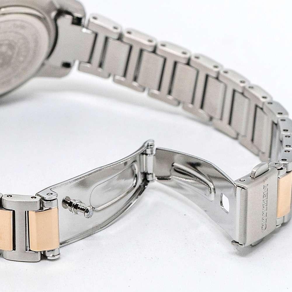 Dây đeo của Citizen EW2596-89A được làm từ thép không gỉ với thiết kế H-link với những mắt xích bo cong, mềm mại. Bộ dây có độ ôm tay rất tốt cũng như mang lại cảm giác thoải mái khi đeo, là sự lựa chọn hàng đầu cho các cô gái yêu thích phong cách sang trọng, tinh tế. Thêm vào đó, dây đeo mạ demi màu vàng hồng ở các mắt dây liên kết giữa và xử lý bề mặt tỉ mỉ khi xen kẽ đánh phay xước kết hợp sáng bóng giúp dây đeo thẩm mỹ và thời trang hơn.
