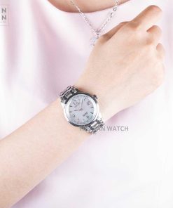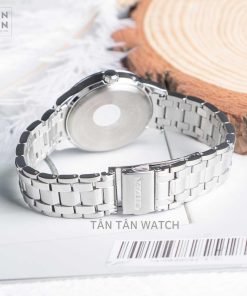 Sử dụng chất liệu thép không gỉ cho cả bộ vỏ và dây đeo mang đến tổng thể liền lạc, màu trắng bạc từ chất liệu tôn lên vẻ đẹp sang trọng vốn có. Bộ vỏ của đồng hồ nữ Citizen FC8001-87D được bo tròn với đường kính 35.8mm phù hợp với cô nàng có cổ tay tròn. Chất liệu thép không gỉ đảm bảo cho đồng hồ bền bỉ trước ngoại lực, chống ăn mòn và hạn chế trầy xước hiệu quả. Đi kèm là dây đeo 17mm thiết kế 5 liên kết kết hợp đánh bóng trên tổng thể phay xước ở 2 liên kết dây và phần niềng bezel. Việc giữ nguyên màu bạc chất liệu vừa dễ phối đồ vừa dễ đánh bóng, bảo dưỡng lại nếu bị trầy xước sau một thời gian sử dụng.